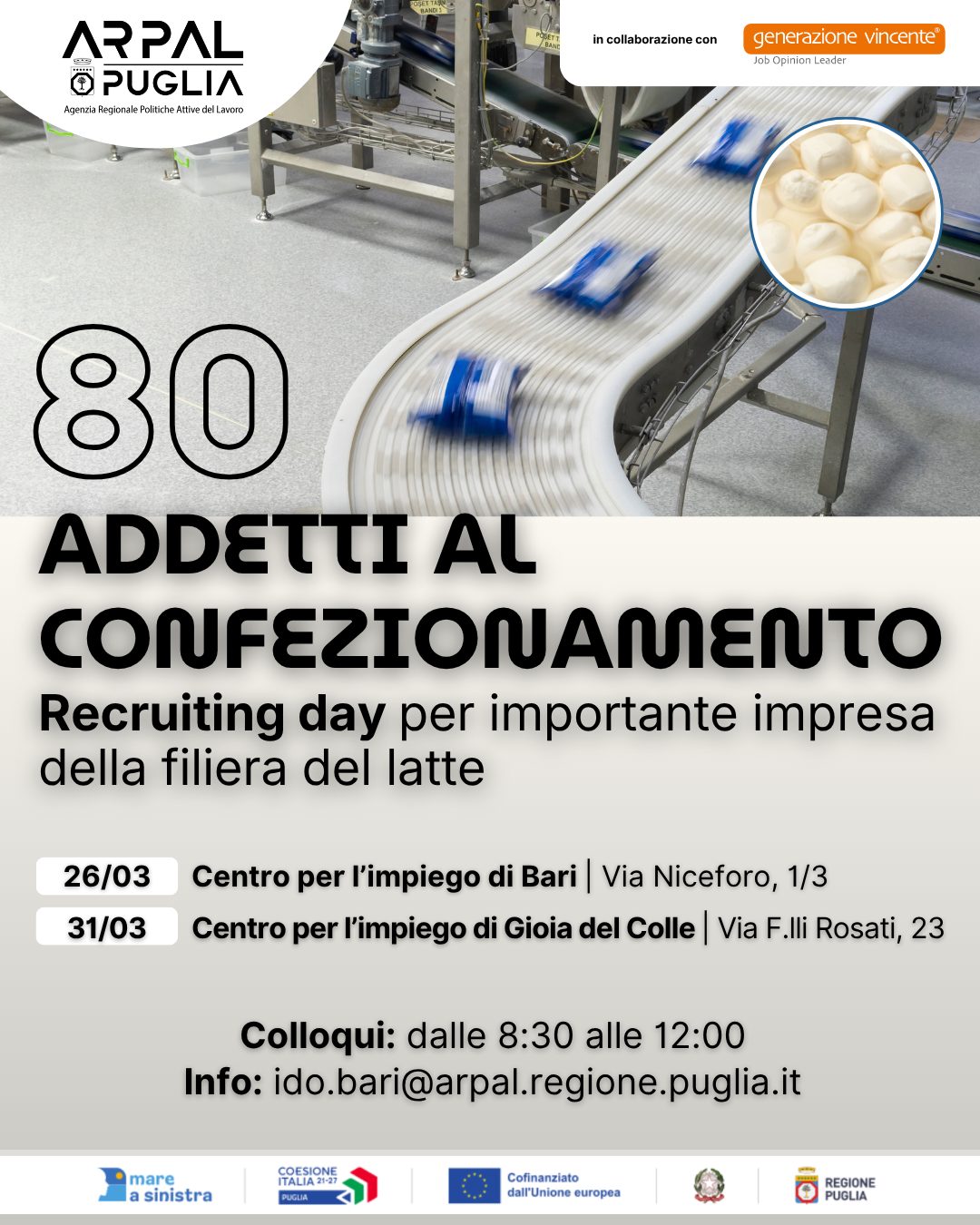 Prosegue l’impegno di Generazione Vincente nel creare occasioni concrete di incontro tra domanda e offerta di lavoro, in sinergia con il sistema pubblico. In collaborazione con Arpal Puglia, sono in programma due Recruiting Day dedicati alla selezione di nuovi profili da inserire presso un’importante realtà della filiera del latte.